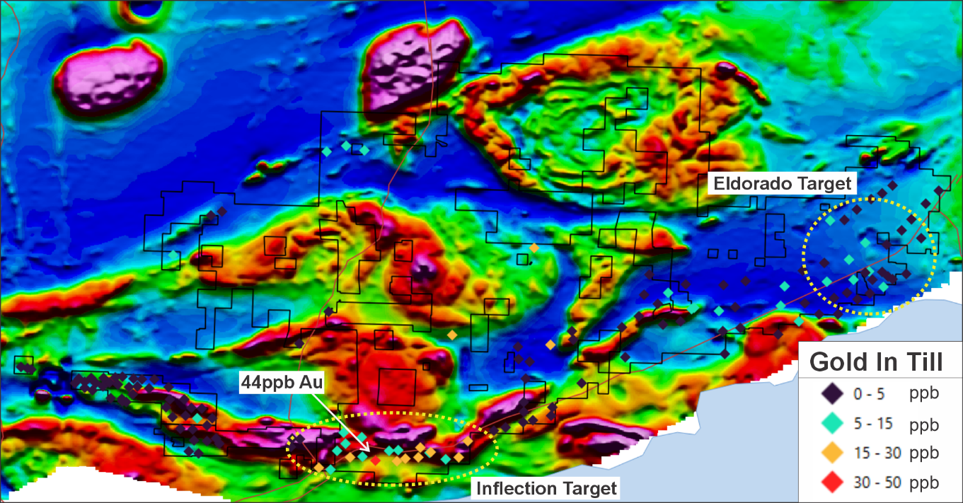 Numerous areas for follow up have been identified, the most prominent of which is the discovery of a six kilometre-long series of anomalous gold-in-till samples named ‘Inflection’, which is located in the central / southern part of the project area (see maps below).