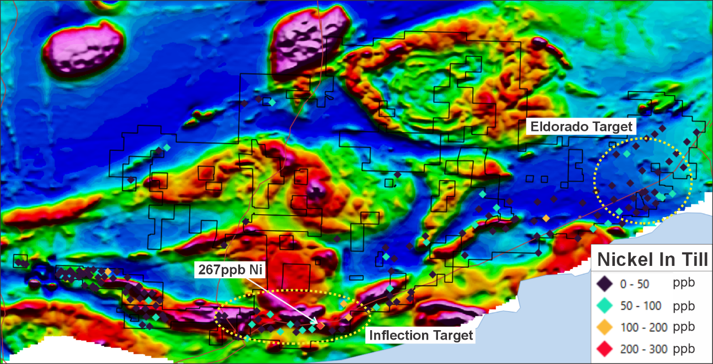 The Inflection target represents a newly discovered gold anomaly with up to 44ppb Au in till samples. The area covers the intersection of several east-southeast and west-southwest trending structures and contains a complex mix of felsic to intermediate volcanics, clastic metasediments, and komatiitic ultramafic rocks. Historic mapping in the area has noted abundant stockwork quartz veining in felsic volcanic rocks. This area has not seen any significant historic exploration, and is a priority target for the Company.